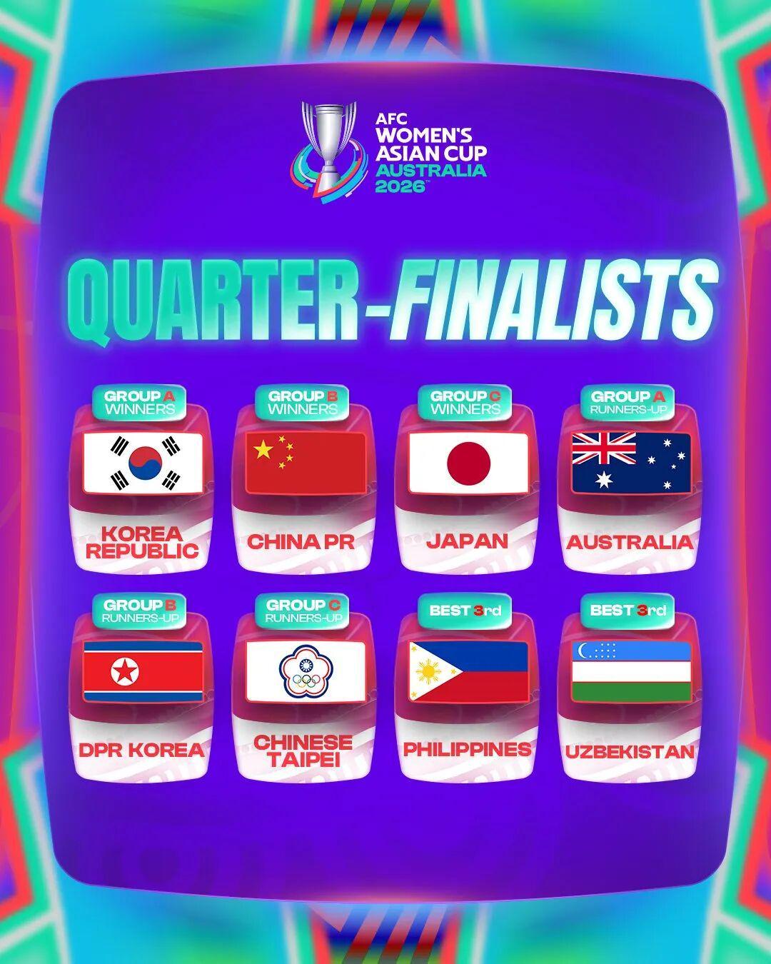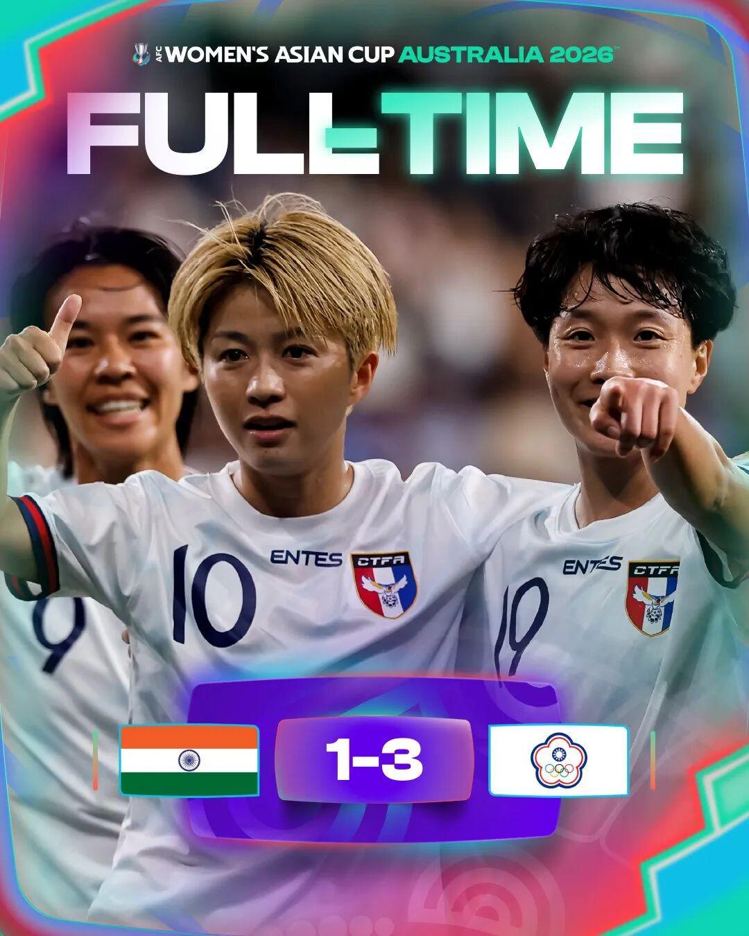 记者王伟报道3月10日傍晚,2026年女足亚洲杯C组最后一轮,中国台北女足对阵印度女足。 最终,中国台北队以3比1战胜印度女足。 这场胜利让她们以小组第二的身份,进入亚洲杯八强。至此,女足亚洲杯八强落位,四分之一决赛中国女足将对阵中国台北女足,日本队将对阵菲律宾队,澳大利亚队对阵朝鲜队,韩国队对阵乌兹别克斯坦队。